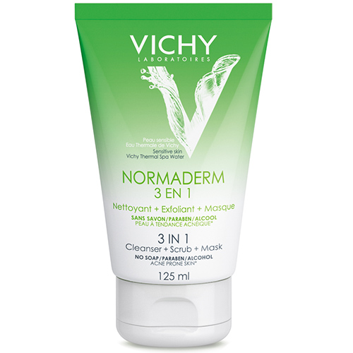 Виши Нормадерм 3 в 1 125 мл мылом без, парабенов и спирта сочетает в себе три действия. Обогащенный Термальной Воды Vichy, подходит для чувствительной дефектов кожи. NORMADERM 3 в 1 сочетает активный "пилинг", успокаивающее средство и 25% глина, для достижения наилучших результатов. Он имеет несколько действий: - очищающий крем: он удаляет кожное сало и загрязнения (в связи с наличием цинка) - скраб: это очищает поры, - маску: она контролирует блеск и разъясняет кожу и цвет лица (в связи с наличием глина с абсорбирующим свойствам). Нормадерм является продуктом для более четкого кожи в течение 24 часов, очищенных в течение 3 дней.