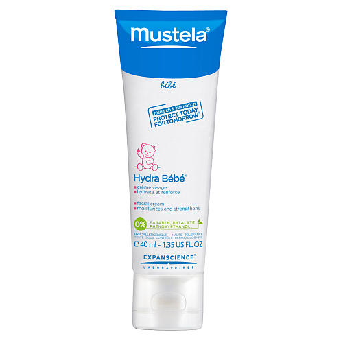 Hydra Baby крем для лица из лаборатории Mustela увлажняет и защищает нормальную кожу ребенка от рождения.
