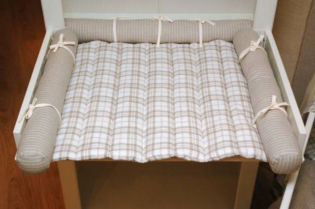Лен 100%, наполнитель в коврике - синтепон, в валиках - синтепух.
