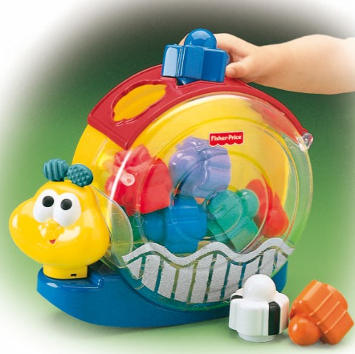 Ребенок бросает цветные геометрические формочки в улитку через соответствующие им по форме отверстия. Затем открывает крышку, вынимает формочки и можно снова начинать игру. Если просто покачать улитку - заиграет веселая мелодия! Из цветных формочек ребенок может строить башни и другие различные объемные композиции на полу или на улитке, сняв предварительно ее домик.