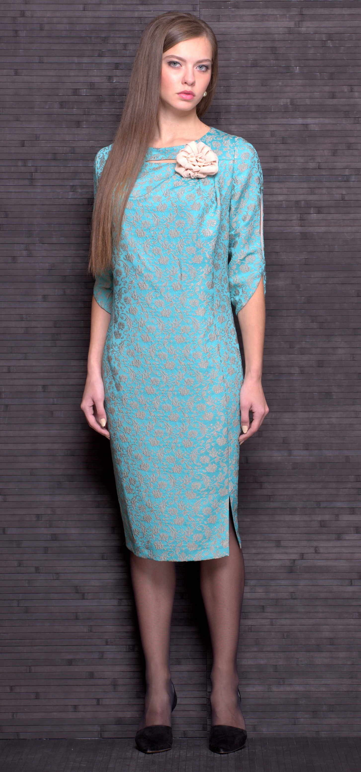 Элегантное платье выполнено из высококачественного жакарда, средней плотности. Силуэт свободный, слегка заужен к низу с округлый вырезом горловины, сбоку потайная молния. Необычной конструкции рукава. Декорировано съемной брошью. Это платье подойдёт для торжественных случаев. Благодаря свободному силуэту деликатно скроет небольшие несовершенства фигуры.