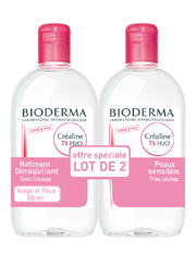 Специально разработано для очень сухой чувствительной кожи, мицеллярный раствор Bioderma Créaline TS H2O Micelle Решение Лот 2 х 500 мл обеспечивает нежное очищение лица и глаз (устраняет водонепроницаемый составляющих).